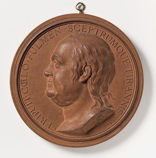 Curator: Immediately, I'm struck by this overwhelming sense of... seriousness. Editor: Precisely! This is an untitled terracotta medallion, crafted in 1778 by Jean-Baptiste Nini. Its Neoclassical style places it within a pivotal moment in French history and aesthetics. The piece is currently housed at the Metropolitan Museum of Art. Curator: It does have that formal air of the era, doesn't it? But there's something almost fragile about it too. Like a memory pressed into clay. Editor: Yes, there's a deliberate invocation of Roman aesthetics visible in Nini’s creation of profile portraiture and the Latin inscription. Curator: I see what you mean, the writing circling feels a bit like a coin or roman pottery... The details are so precise; it’s as if he's trying to immortalize the sitter, not just represent them. Editor: Consider the implications of that desire for immortality. This piece not only exemplifies the Neoclassical obsession with order and reason but also intersects with questions of power and legacy. It asks us, "Who gets to be remembered and why?" Curator: Which brings me back to my first feeling, about it being... weighty. Not just literally, but in its intent. Though what I am drawn to, against all that, is the subject’s hair—so life like and seemingly unruly in comparison to the carved profile and circular composition. Editor: That juxtaposition is brilliant. The unruly hair serves as a point of entry to address how gendered and racialized societal standards of beauty, as represented here in idealized European portraiture, often fail to fully capture human experience. How the subject is rendered with an emphasis on civic virtue… Curator: All of which hides, and is belied by that single, wandering tendril. It’s almost mischievous, isn’t it? Editor: Almost as if it knows what you are thinking…a final thought for our audience about such questions about legacy and power this sculpture makes me think about? Curator: Precisely! The power to define, to remember, and to question those definitions—that's what I'll take away from it today.