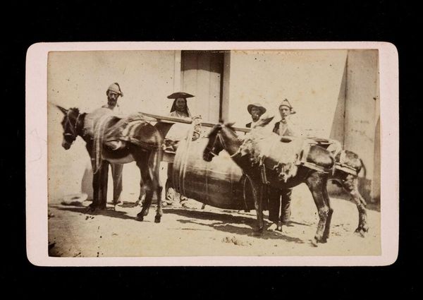 Curator: This is a photograph entitled "Costumes of Michaelenses, Azores, Portugal (three men standing, ox harnessed to cart)," attributed to A.J. Rapozo. It’s a small mounted print. Editor: The image gives me a sense of the somber, almost stoic, existence of rural life; the ox is magnificent, though. Curator: I agree. Consider how the costumes depicted speak to social roles and local identity, particularly in agricultural labor. The very harnessing of the ox to the cart symbolizes the material realities and daily routines. Editor: Right, and the ox itself becomes a potent symbol. It's not just an animal; it represents labor, strength, and a connection to the land, which are timeless and deeply cultural. Curator: Indeed. And the visible wear on the cart, the texture of the clothing, it all points to the lived experience embedded in this simple, striking photograph. Editor: Ultimately, this image embodies the enduring power of symbols rooted in material experience, shaping cultural narratives across generations. Curator: Yes, a compelling intersection of material reality and symbolic weight.