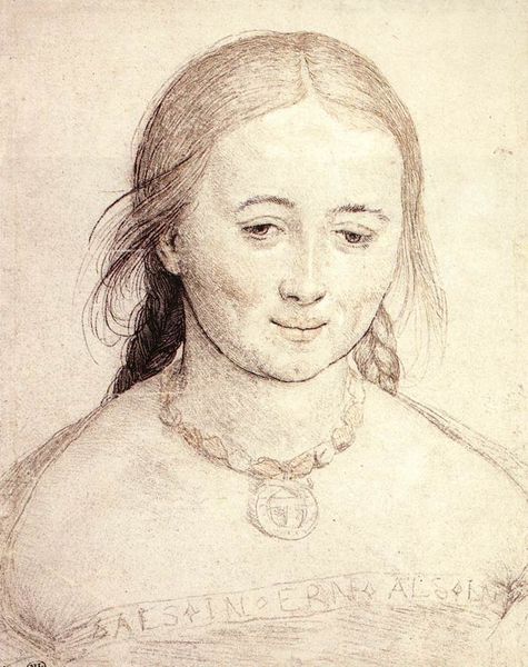 Hans Holbein the Younger captured Anna Meyer's likeness using watercolour and opaque colours, heightened with white, on paper. Immediately, the linear precision strikes us. Holbein's masterful control of line defines the contours of Anna’s face, her elaborate costume, and especially the cascade of her hair. This emphasis on line over color flattens the image, creating a stylized effect rather than a realistic depiction. Consider the composition. The profile view, set against a neutral background, directs our gaze to the precise details of her features and clothing. This formal approach, typical of Holbein, elevates the sitter to an almost iconic status. The red belt, a stark contrast to the muted palette, punctuates the composition, drawing attention to the sitter's waist. Holbein doesn’t just record likeness; he constructs an image, using formal elements to convey status and character. In viewing the artwork, observe how the linear and compositional choices invite us to interpret Anna Meyer not just as an individual, but as a figure carefully constructed within the visual language of the time.