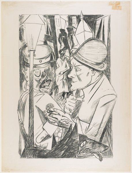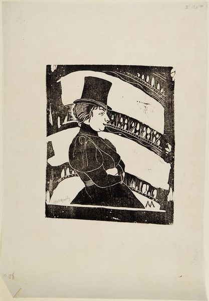 Editor: This is Lesser Ury's "Seated Man in Top Hat," currently held at the Harvard Art Museums. The stark blacks and whites create such a melancholic mood, and I'm curious about the artist's intentions. What do you see in this piece? Curator: Note how the artist uses contrasting values to define form, particularly the sitter's attire. Observe the structure within the composition: the interplay between light and shadow, the balance of masses. The artist has created a semiotic relation through an understanding of pictorial balance. Editor: I think I understand now, thank you! Curator: Indeed, a close reading shows how artistic decisions around composition and the materiality create meaning.