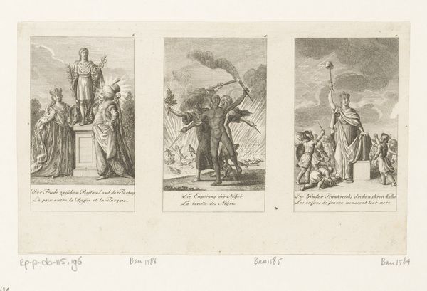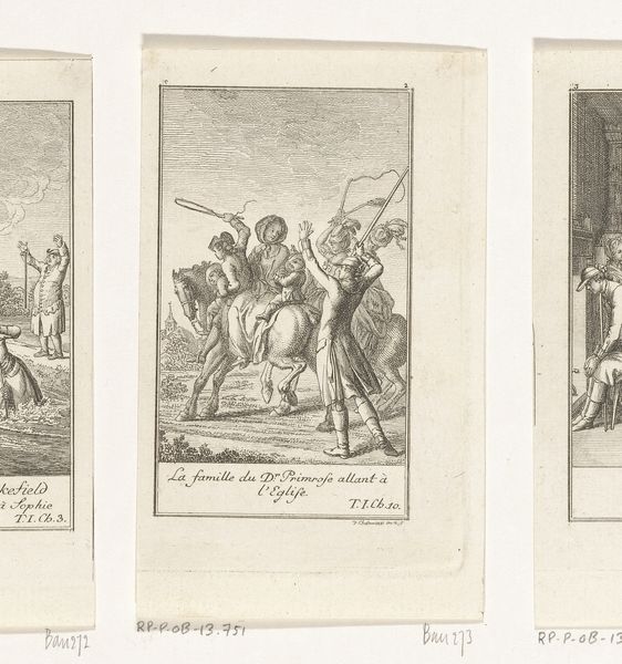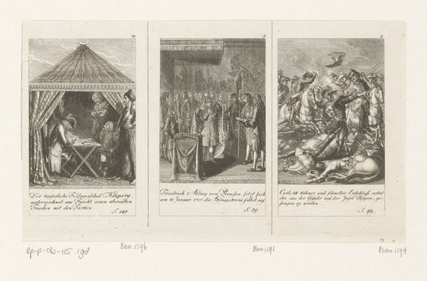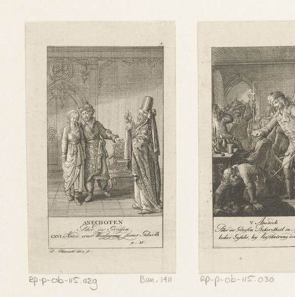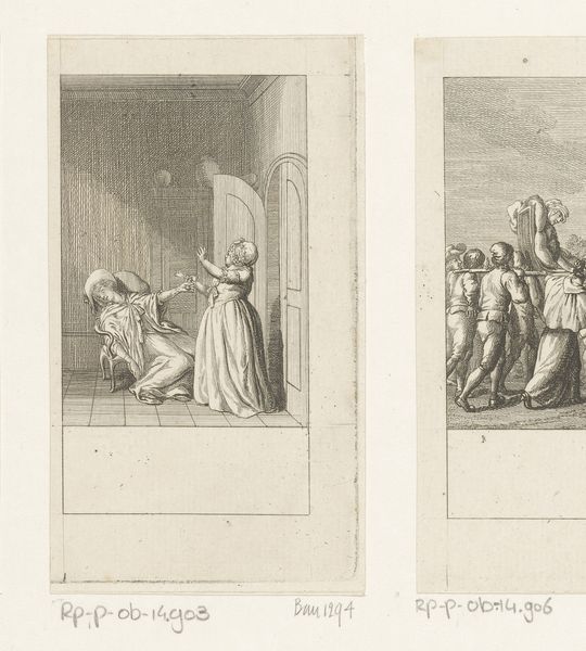 Daniel Nikolaus Chodowiecki created this print, Karel de Dikke wordt afgezet, in the late 18th century using etching. It depicts the deposition of Charles the Fat, a 9th-century Holy Roman Emperor. During Chodowiecki’s time, the Enlightenment was prompting new perspectives on history and power. Consider the emotional weight of this scene: a corpulent ruler being stripped of his crown. The print subtly critiques the concept of divine right, reflecting the era’s questioning of inherited power. Gender and class are not explicit here, yet they underpin the narrative of leadership and authority. "Karel de Dikke wordt afgezet" subtly participates in a broader discussion about who should lead and how. Chodowiecki invites us to reflect on the transient nature of power, and the personal cost of leadership. How does this historical deposition resonate with contemporary questions about leadership and authority?