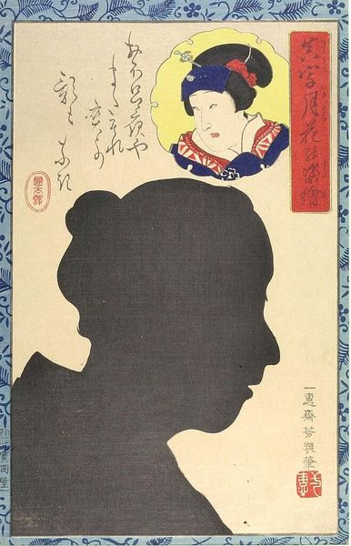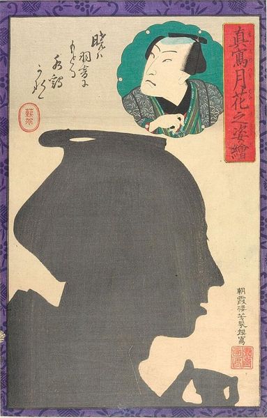 Editor: Here we have Utagawa Yoshiiku's "Silhouette Image of Kabuki Actor," dating back to the 19th century. It's a woodblock print currently held at The Met. I'm immediately drawn to the striking contrast between the solid silhouette and the vividly colored portrait. What can you tell us about the imagery at play here? Curator: This print offers a fascinating layering of identities and symbols. Ukiyo-e prints often depicted Kabuki actors, popular figures embodying both artistry and celebrity. The silhouette itself functions as a powerful emblem. What does a silhouette represent to you? Think about its inherent qualities. Editor: It's a shadow... a ghost, an absence... but also an easily recognizable form. Curator: Exactly. It is a trace, a reduction to pure outline, a representation stripped of detail yet instantly evocative. Now, consider the Kabuki actor within the disc. Notice his elaborate makeup, costume. Editor: The make-up emphasizes the drama. Curator: Indeed, but this is layered. His presence—compared with the ghostly shape beneath, framed with text—offers the "true" persona, while the shadow hints at other depths. This work hints at both presence and absence, performance and reality, constructing and deconstructing the figure's identity for its intended public. Editor: So it's a commentary on the performative nature of identity, celebrity, and perhaps even memory itself? Curator: Precisely! The enduring appeal of ukiyo-e lies in how these prints captured and, arguably, shaped cultural memory. Yoshiiku asks us to look beyond the surface to grasp a richer meaning encoded in both shadow and light. Editor: That is incredibly helpful. I never considered the tension between what is visible and what is concealed. Curator: And how that interplay resonates through time! It’s in grasping these enduring patterns of symbol and meaning that we can learn to truly 'see' art from the past.