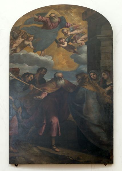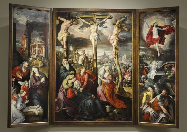 Curator: Right, let’s take a look at this intriguing piece: "Drieluik met de Hemelvaart van Maria," a triptych painted in 1772 by Paulus Constantijn la Fargue. Editor: Well, my initial impression is one of dynamic upward movement, but with a surprisingly somber palette. The earth tones really ground what should be a triumphant scene of ascension. Curator: Indeed. The subdued colors certainly affect its reading. Consider how the materiality of oil paint at this time allowed for layering and glazing to create that depth, almost pulling you into the heavens. It's fascinating how La Fargue balances that weightiness with the ethereal subject matter. We see so many figures, the community is clearly central here. Editor: Absolutely. The central panel is so densely populated, contrasting with the almost isolated figures on the side panels. This density emphasizes the communal aspect of the Assumption – it’s a public spectacle, a moment witnessed and interpreted by many. We also shouldn’t ignore the influence of baroque aesthetics in Dutch painting. Curator: Very true, and that triptych format suggests both a tradition and a product; not solely something hung in a home but also an artwork available for viewing within, perhaps, church interiors or even domestic spaces? Editor: Precisely! Think of the context: the rising merchant class, the increasing accessibility of art. This piece walks a line between devotional object and art commodity, making this moment in time so interesting. Its very form promotes circulation of meaning. Curator: I agree. The interplay between the ascending figure of Mary and the earthbound figures around the sarcophagus is really highlighted here. Even the way they manufactured the triptych contributes to this division: each piece can stand on its own, but they combine together in their display! Editor: I see this painting now with new appreciation, by appreciating both its material elements and social position. The interplay between tradition, technique, and the emerging art market is complex here. Curator: It definitely complicates a straightforward reading, making it richer for interpretation.
