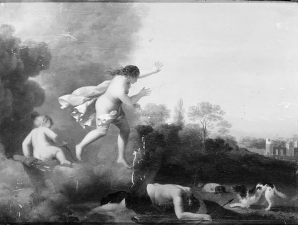 Curator: This painting is titled “The Origin of the Red Rose,” and it’s attributed to Carlo Maratti. It was created sometime between 1640 and 1713. You can find it here at the SMK, Statens Museum for Kunst. Editor: My initial feeling is one of unsettled beauty. There’s this pale, almost ethereal figure contrasted against a rather dark and almost rugged landscape. It’s quite striking, like a classical ideal jarringly inserted into a more chaotic reality. Curator: The clash you're picking up on is fascinating, isn't it? It speaks to the complex symbolic world Maratti constructs here. Note how the nude figure occupies a space teeming with roses. The roses here, are a signifier for love, perhaps a memory of an ancient goddess as Venus or Aphrodite whose transformation gave rise to red roses from white. It draws from Ovid's *Metamorphoses*, with a similar origin tale for anemones. Editor: I see it! This all points to how heavily classical antiquity influenced not just the style but the cultural and narrative touchstones during the Baroque period. Even the somewhat theatrical pose of the figure feels borrowed from ancient sculpture. Curator: Absolutely. And look closer at those roses, nestled beside the two doves. Dove-rose symbolism in Baroque iconography reinforced classical ideas that the seeds of beauty or even sacred love sprang up between deities, imbuing roses and even white flowers with romantic longing and perhaps sadness given their delicate ephemeral nature. Editor: I’m really struck by how this piece might have functioned within the social landscape of its time. I wonder where it might have been displayed and what kind of audience would have viewed it? Was it an aristocratic parlor, a public gallery? The piece’s accessibility would depend so much on this. The sensuality also raises questions about the expectations and norms for viewership back then. Curator: Those are insightful points. A work like this could very well have been situated in spaces designed to display power, taste, and, crucially, an understanding of classical myth and artistic conventions. A sophisticated visual language for a very specific elite. Editor: Considering those spaces, the painting's function transforms. It becomes more than a pretty scene; it’s a social statement, perhaps a conversation piece that affirms status and education. The roses, doves, and Venus, it becomes more about conveying wealth, and sophistication, as objects, not what they literally mean or illustrate in the artwork. Curator: Precisely. It serves as a window into how cultural memory and mythology are actively employed within societal structures, doesn't it? I’m taking away so much more about that context just thinking of it along those lines. Editor: Indeed. What I found thought-provoking in looking at it in all respects: considering visual power and the art history canon is always time well spent.