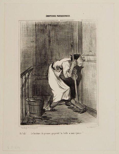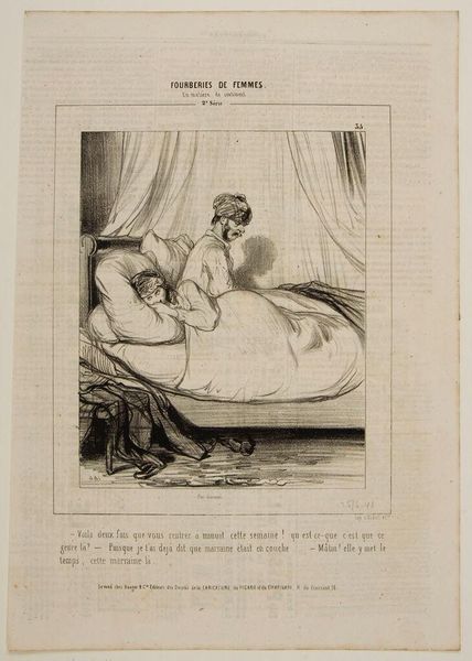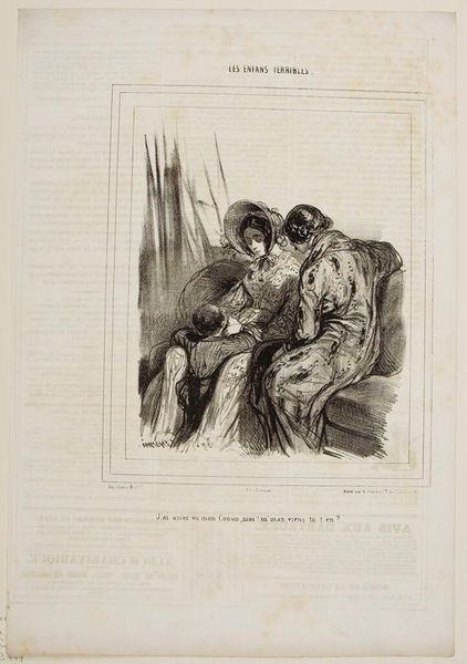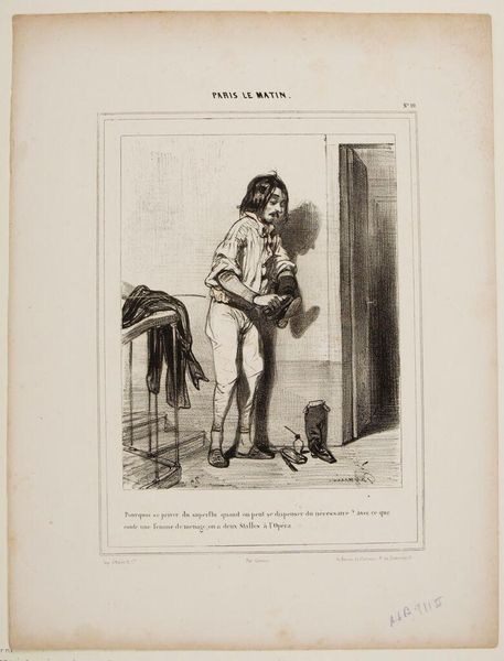 Editor: This is a print by Paul Gavarni, titled "Me, I signed for five hundred francs and I only have three hundred of it . . .". The scene is stark and depicts apparent poverty. What can you tell us about this work? Curator: Considering its context, we must examine the paper, the printing process, and Gavarni's role as a lithographer for journals. How did the economics of printmaking influence his subject matter and reach audiences? Editor: That's an interesting point about accessibility. Did the printing process democratize art viewing, bringing images of working-class life to a broader audience? Curator: Precisely. Gavarni's prints reveal the means of production behind the image, exposing the labor and economic realities that shaped both the subject and the art itself. Editor: I hadn't considered the material conditions so directly influencing the artistic content. Thanks! Curator: Indeed, it prompts us to question the boundaries between art, craft, and social commentary.