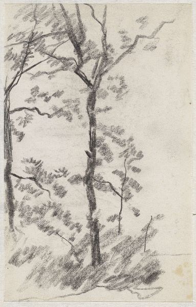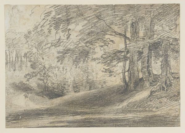 Curator: This drawing, entitled "A Clump of Trees," was created around 1757 by Thomas Gainsborough. Executed in pencil, it provides a glimpse into his plein-air practice. What do you make of it? Editor: The immediate impression is one of quiet contemplation. It's quite somber, with dense shading that suggests an enclosed, almost secretive space. There’s a sense of being enveloped by nature, though filtered through Gainsborough's particular sensibility. Curator: It’s interesting that you pick up on that. Gainsborough, although primarily known for his portraits catering to the elite, was also deeply interested in landscape. He frequently sketched outdoors, using these studies as groundwork for his paintings. We can see this engagement in his depiction of nature's inherent symbolic connection to emotional states. The trees huddle together almost for comfort or perhaps the viewer's disquiet. Editor: And how that plays into ideas of Romanticism. We have an embrace of nature, but one laced with subjectivity and feeling. This is less about botanical accuracy and more about translating the *experience* of being in nature. And considering the socio-political upheavals of the 18th century, finding solace, or even premonitions, within natural imagery makes a lot of sense. The way the light struggles to penetrate is almost foreboding. Curator: I agree. Consider how Gainsborough's social standing influenced his presentation of landscape. Though landscapes were not valued by the British art establishment, his upper-class and gentry clients sought pastoral images which gave rise to symbolic implications: nature’s indifference or resistance, class status…even impending changes to property or estates. He had to thread a very tricky needle, appealing to cultural expectations while, perhaps, undermining them simultaneously. The gnarled branches might imply decay even amidst natural abundance. Editor: That’s a key point: the consumption of art, even something as apparently straightforward as a pencil sketch, is always embedded in power dynamics. Gainsborough uses the established language of landscape, while, at the same time, infusing a modern mood of self-reflection. His pencil gives the image life. Curator: This speaks to Gainsborough's profound artistic intelligence. He imbued "A Clump of Trees" with layered meaning accessible even today. It shows his keen observational skills but also, most compellingly, his attunement to a shifting cultural landscape. Editor: Exactly, a simple drawing becomes a space where we can consider how we understand both ourselves and the world around us through the visual arts.