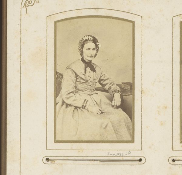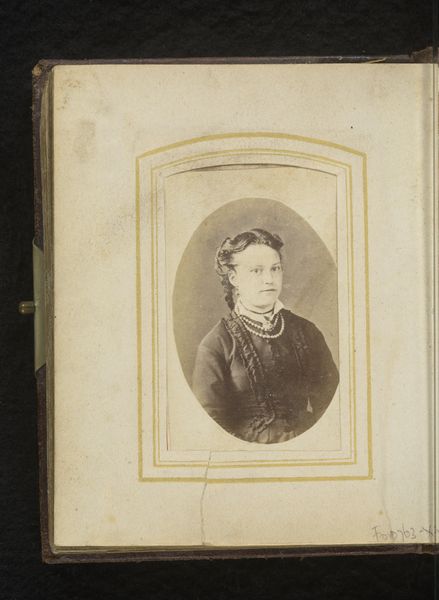 This is Henri Xavier Harcq’s small, undated portrait of a woman with a bonnet. It's a photograph mounted on card, with a decorative border. The photograph is dominated by soft, muted tones which give a sense of calmness. The oval shape of the portrait itself creates a contained space, drawing focus to the woman's face. Her direct gaze meets ours, yet there is a formality that keeps a distance. The structure of the image is quite rigid, bisected by the clear, symmetrical line of her bonnet, which anchors the composition. However, the texture introduces complexity. The grainy quality of the photograph and the intricate lace border contrast with the smooth, plain background. This juxtaposition is interesting—the softness of the image against the firm lines of the composition. Ultimately, it invites us to consider the relationship between representation and reality. It reflects a particular moment in time viewed through the lens of photographic technology.