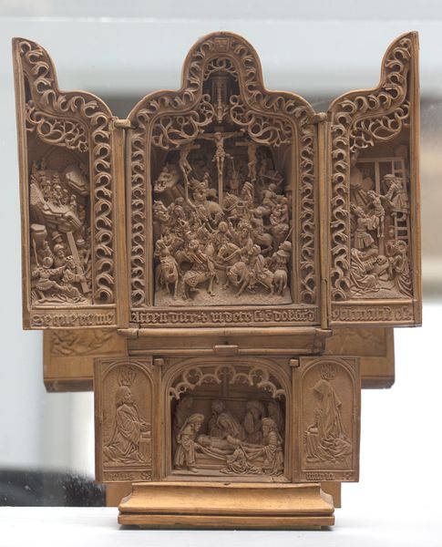 Curator: This striking "Triptych," dating from around 1500 to 1530, is attributed to Adam Dircksz. It combines the tactile qualities of wood carving with the vibrancy of tempera paint. My immediate reaction is its intricacy and formal rigor. The way the artist compartmentalizes the narrative within these architectural frames, it’s almost like a miniature stage. Editor: It certainly feels devotional. There's a concentrated stillness about it. The triptych format itself feels charged with religious significance, almost like altarpieces and private worship colliding to embody lived piety during times when few had access to religious texts. The figures here feel intentionally rigid. Curator: Precisely. The hierarchical scale, the carefully arranged drapery, it’s all so controlled. Observe how Dircksz employs line and texture to delineate form. The Gothic style framework embraces but simultaneously traps the scenes. Consider the surface: each indentation catches light, bringing the figures to life and drawing the eye along each figure's vertical length. Editor: That reminds me about medieval notions of women in particular. It is hard not to consider how Dircksz utilizes these women's bodies and actions in the side panels as moral exemplars for conduct within the social codes of that period. Each are haloed, queen-like. Do we see an embrace, perhaps unconsciously, of a growing social shift, when one begins to consider a new kind of autonomy through choices offered by increasingly diversified labor practices? Curator: An intriguing possibility. From a structural viewpoint, this Triptych's strength lies in its considered articulation of surface and its careful employment of perspective and ornament, so in terms of a pure study of design, it's an excellent work. Editor: Indeed. Ultimately, beyond its aesthetic merit, I believe its power is as a symbolic mirror, capturing and reflecting not only the spiritual ideals of the time but also, perhaps, a growing shift in how religious stories reinforced, or failed to adequately shape, societal assumptions.