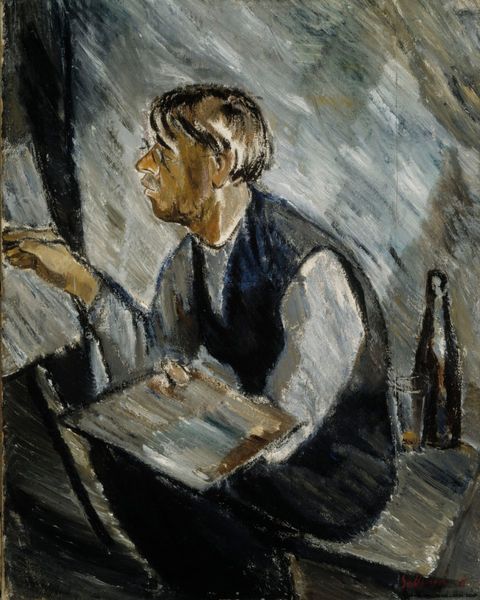 Editor: Here we have Philip Little’s oil on canvas, *Portrait of Robert Koehler*, from 1910. I’m immediately struck by its subdued palette. What do you see in Little’s composition, and how would you describe its formal qualities? Curator: Note the calculated arrangement of light and shadow. Little employs a limited color palette, favoring muted browns and grays, to direct our gaze. Observe how the light strategically falls upon Koehler's face, highlighting the texture and form, while the rest of the scene remains softer. Consider the interplay between the figure and the ground. Editor: It seems like there is some interplay in brushstrokes as well, yes? Curator: Indeed, the visible brushstrokes contribute significantly to the overall effect. They add a sense of immediacy and tactility. Focus on the artist's control over the medium. See how the strokes become shorter and more agitated near Koehler's hands, contrasting with the more subdued strokes defining the backdrop. Does this deliberate variation influence your interpretation? Editor: Yes, definitely. It gives a sense of dynamism and movement to an otherwise still scene. What do you think it signifies? Curator: From a purely formalist perspective, the specific meaning isn’t my immediate concern. However, we can analyze the tension created by the formal arrangement: The soft background gives a spatial quality, while brushwork creates dynamic movement in the foreground. How these elements harmonize contributes to the success of the composition. Editor: That’s so helpful. I often look for the narrative, but analyzing the formal elements first offers a more objective lens. I learned to focus on lines and shades. Thank you for illuminating those choices! Curator: A deep consideration of artistic form reveals artistic choices which we may miss by hunting only after narratives or cultural information. Keep the power of structure and materiality in mind when experiencing art.