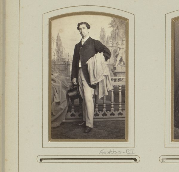 Editor: This is "Portret van een staande man bij een zuil met vaas, voor een achtergrond waarop het Colosseum is afgebeeld," a photograph by Fratelli d' Alessandri from around 1870. The gentleman looks so formal and composed, and that backdrop feels more symbolic than descriptive. What kind of story do you think the artists are trying to tell here? Curator: Indeed, the composition reveals a tapestry of cultural aspirations and memory. The inclusion of the Colosseum, of course, is not merely setting, but a potent symbol. What does the Colosseum evoke for you? Editor: Ancient Rome, the glory of the empire... also, ruins and decay. Curator: Precisely! It speaks to power, legacy, but also to the inevitable decline of civilizations. This photograph subtly interweaves personal identity with historical grandeur and decline. The vase is also a form echoing antiquity – a vessel. Perhaps intended to symbolize this man’s lineage? His education? A cultivated soul? What psychological implications do you think that has on the presentation of self? Editor: It's almost like he's being presented as a continuation of that historical legacy. A scion! Curator: An heir, perhaps, or someone aspiring to embody those ideals. And the contrast between the crispness of his modern suit and the faded glory behind him creates an interesting tension, doesn’t it? The past weighing on the present. Do you agree? Editor: Absolutely! I never considered it in such depth before, but now I see all these layers of meaning. Thank you! Curator: It’s in photographs such as these that we unearth our collective psyche! And your interpretation helps to ensure these memories continue to thrive.