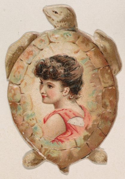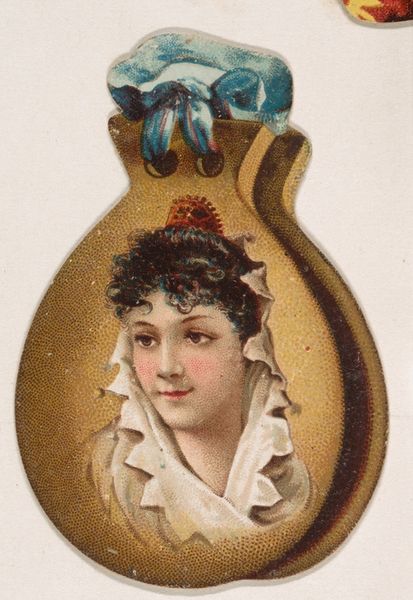 Curator: This is "Tambourine," a print from the Novelties series created around 1889 by the Kinney Brothers Tobacco Company. It's currently held in the collection of the Metropolitan Museum of Art. Editor: She's striking. It's such an ethereal face, framed by this dark, almost mournful veil—juxtaposed with the cheer of the tambourine. Curator: Exactly. It's a color print, a genre piece showcasing the decorative art that was gaining popularity with Japonisme influences trickling through at the time. Think commercial art, but aiming for high aesthetic appeal. Editor: There's a playful quality to it, though. The tambourine almost feels like a little stage, and she's peeking out at the audience. I can almost hear a faint rattle. Curator: That’s interesting! In this period, marketing materials often adopted artistic styles to elevate the perceived value of the product. Kinney Brothers used these trade cards as a means to make their tobacco products more appealing. Editor: I bet this card got slipped into many pockets and collected! This hints at an imagined encounter, you know? Who is she? Where is she going after the performance? It sparks stories, really. Curator: And how it speaks to the wider circulation of images at the time! Color prints became ubiquitous, entering homes, shaping popular culture, creating connections between consumers and idealized imagery. The face, the tambourine...it became a symbol in a wider world. Editor: Right. A little world within the pocket, you could say. But what if she's not a performer at all, but hiding, concealed by the lace? She is both hiding and revealing, you know, an enigmatic smile under the guise of this strange portable little instrument. Curator: It truly shows the power images have. Whether in an art gallery, a collector’s album or advertising tool. Its appeal transcends social strata and it influences the everyday world around us. Editor: It sure does! It leaves you thinking about fleeting beauty, or maybe hidden intentions.