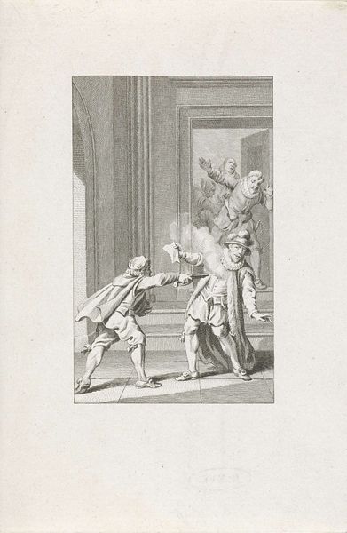 Curator: Here we have “Elpin en de dichter,” an engraving dating from 1778 to 1785, currently residing at the Rijksmuseum. It was conceived by Noach van der Meer the Younger. Editor: This image feels almost theatrical, doesn't it? Like a single frame extracted from a play, all tense gestures and neoclassical backdrops. And that subdued gray tonality - so restrained and serious. Curator: That's neoclassical aesthetics for you! We are looking at a fascinating intersection of classicism and Enlightenment ideals. The scene references Elpin, highlighting an ancient narrative. We could dive into the political undercurrents of depicting such stories in the late 18th century. There are questions to be asked about morality and civic duty. Editor: Absolutely! I love how this one tiny slice, this engraving, can open up to this bigger reflection on morality. The body language too - there’s such a charged relationship there - almost confrontational! Curator: Consider the positioning of the figures, right? It’s all about power dynamics being visually represented through stance and classical references that resonate deeply within its historical context. How does this imagery challenge or reinforce existing power structures? Who is positioned where in the artwork? Editor: I was thinking too that this entire moment is being portrayed as almost timeless - these garments drape on these people who don't seem particularly warm, don't you think? And that vase that looks to be the real heart of the picture. All frozen by grief or whatever it is. What if it was something completely different we couldn't put a finger on...a touch of playful malice in the drama? Curator: Well, readings change with the times, isn’t it? We're dealing with Neoclassicism, and so a specific set of values and artistic ideals were in play back then, including didactic intent. So if it feels very set, and somewhat rigid, then it is. Editor: Precisely! It's fascinating how each viewing and conversation like this peels back another tiny layer, which alters the narrative just so slightly, doesn’t it? Always morphing. Curator: Indeed. "Elpin en de dichter" gives us a lot to think about regarding not only the subject's political moment but also about its legacy through today. Editor: Yeah, there’s that chill elegance that almost invites reinterpretation and reminds us how powerful imagery and narrative remains, even centuries on.