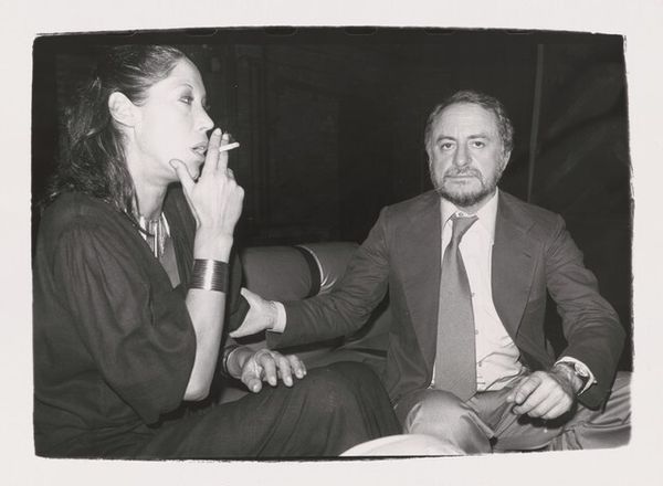 Curator: We're looking at a captivating photograph from 1958 by Robert Frank titled “Jan Müller.” Editor: My first impression is one of quiet intimacy. The contrast is stark, but it somehow creates a gentle mood. It's interesting how light falls on her face. Curator: Indeed. Formally, the high contrast, characteristic of Frank’s work at this time, throws into relief the geometric construction of the image: the male figure cropped, facing the female, with both anchored against that flat, ambiguous black ground. The slight tilt adds tension. Editor: Müller, I think, would likely be an interesting study in art history, but perhaps the way Frank has framed the woman reveals a culturally understood moment, of female introspection perhaps? The head tilted in a thinking, emotive, possibly passive mode? Her half-smile has echoes in iconic female portraiture going back centuries. Curator: Possibly, but consider also how the texture, or lack thereof, in his tailored suit anchors that figure. The artist directs your gaze precisely toward that point where the suit meets the plain backdrop. The line bisecting them. She however fades into her own textured garb. Editor: Do you feel Frank seeks to express male formality set against the mystery, literally the textured experience, of women's experience? After all, he worked in a postwar moment where male authority figures dominated social narrative, right? Curator: It's tempting to apply a narrative reading, but let's also consider the raw materiality here. The graininess, the slight imperfections. Frank wasn’t interested in perfect representation. He prioritizes emotional authenticity and that raw photographic aesthetic, even the imperfection in the scan. Editor: Agreed. Perhaps his symbols reside more in his media choices, that grainy dark statement perhaps capturing an angst emblematic of that postwar beat generation. Curator: Ultimately, Frank prompts us to question how we read both the formal construction and cultural undercurrents in the simplest portrait. Editor: Frank indeed captured not only Müller, but an era’s feeling of artistic possibility – of searching and expressing oneself through image and attitude.