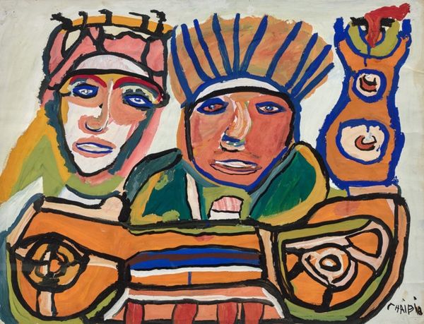 Curator: Here we have Chaibia Talal’s, "Spectateurs de tennis," created in 1987 with acrylic paint. Editor: Whoa, vibrant! Like a Technicolor dream! There’s an innocence in those faces, even a naive joy that jumps right out at you. Reminds me of childhood doodles, but with a soul. Curator: Talal, a self-taught Moroccan artist, gained recognition for her intuitive and colorful style, often depicting women, children, and scenes from Moroccan life. Her rise defied cultural expectations in her historical and social context. Editor: Right? These figures…they feel archetypal, you know? Universal. They're just…there, being, experiencing joy. The slightly rough, bold lines...it adds to that immediacy, that "just being" vibe. No fuss, pure expression. I’m pulled right into the painting and feel as if I’m at the game, too! Curator: It's intriguing how her work fits—or perhaps strains—against established categories. One sees elements of Fauvism or even Pop Art in the high-key color choices and flattened perspective, yet these are filtered through a deeply personal and culturally specific lens. Her position as a celebrated female artist in the male-dominated art world certainly shifts our understanding of art hierarchies. Editor: Absolutely. The raw, unstudied quality can fool you. You think it’s simple but…it’s packed! Emotion, story…it’s like looking at a tapestry woven from pure feeling. What appears “naive” to some might actually be a profound articulation of lived experience outside academic constraints. Curator: I concur. Her contribution lies not just in representation but also in challenging the dominant narratives of art history, making space for marginalized voices. Editor: It hits deep! It is a great way to remember that creativity resides everywhere, unburdened by formal training, speaking its unique, vital truth. Curator: Precisely! I am always deeply moved at the artist’s contribution in decolonizing artistic space. Editor: And that's something worth celebrating, isn't it?