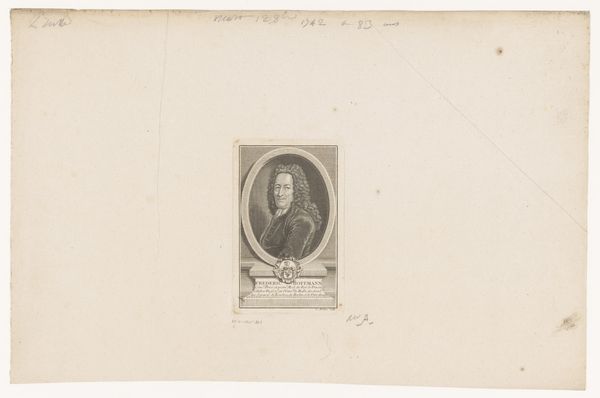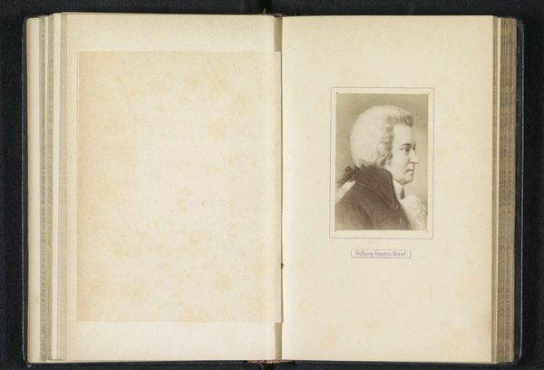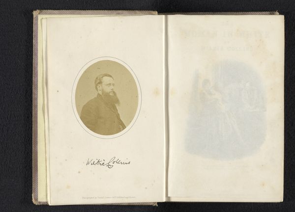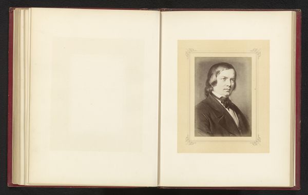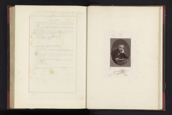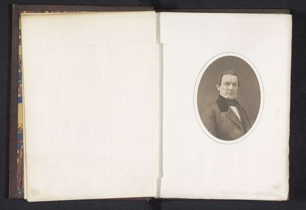 Curator: Here we have "Portret van Léon Le Métayer-Masselin," created before 1861 by an unknown artist. What strikes you immediately about it? Editor: The somber tonality. Even considering the inherent qualities of aged photographs, there’s a weight to it. The handwritten script on the facing page appears deliberately obscured, hinting at forgotten narratives. Curator: That script is interesting, indeed. It presents "COLLECTION GALERIE MYLAIRE'S" and features some rather stylized typography. Given that it's housed within what appears to be a collection or album, do you see any familiar motifs of nineteenth-century photographic portraiture, and what meanings might we derive? Editor: The oval framing of the portrait isolates him, sets him apart as someone of note, while also suggesting perhaps a sentimental function as a memento. The overall faded look lends it an aura of melancholy, common with memorial imagery. We see that even now. Curator: And there's also that contrast. Juxtaposed with the clear portrait, we have text in an artful typeface—perhaps deliberately faded—and a crest, all contributing to a larger narrative that may elude our easy reading. It’s clearly constructed. What might that mean in terms of self-representation in this era? Editor: The man projects an air of composed respectability—note the tailored coat, bow tie, controlled expression. Yet, the homemade paper and script typeface adds an intriguing dimension, complicating his carefully crafted image, as though something slightly subversive is hiding beneath a formal portrait. Is it self-aggrandizement or ironic critique? Curator: Those contrasting symbolic elements hint at the evolving dynamics of social identity at this time. I see both ambition and self-consciousness present. Editor: Exactly! We must not strip such work from that consideration and view it purely as representation. I’m reminded again of how images bear meaning far beyond their subjects’ mere likenesses. Curator: It brings to light how intertwined artistic, cultural, and personal history becomes in just a simple open book. Editor: A fading window into then, an eerie mirror for now.