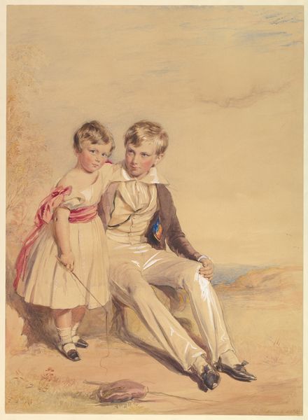 Josef Kriehuber's watercolor painting "Children" presents a formal arrangement of four young figures against a muted backdrop, measuring 29 by 37 centimeters. The composition emphasizes a structured balance, with the children positioned in a way that draws the eye across the canvas. Kriehuber's calculated placement of the children and the subtle chromatic choices serve to reinforce bourgeois ideals by constructing a vision of ordered harmony. The structure of the painting creates a narrative of social cohesion and controlled relations, in which the careful arrangement of its subjects mirrors the era's emphasis on social structure and decorum. The use of light in the watercolor imbues the scene with a sense of temporal stability, which is constructed through carefully applied washes and a limited palette. This artistic choice may invite us to consider how formal aspects of art can embody or critique the prevailing values and philosophical considerations of its period.
