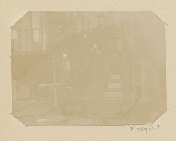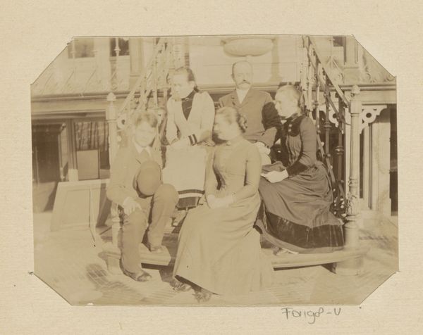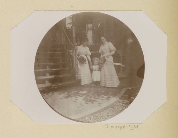 Editor: Here we have a photographic print from what looks like the 1890s, "Cato Piek-Asser, staande bovenaan een buitentrap naast haar moeder en een onbekende man tijdens haar bruiloft, onderaan de trap staat Gesiena Piek met een onbekende vrouw en kind". It has a slightly faded, ethereal quality. What story do you think the materials and processes tell us? Curator: The materiality of this print points to crucial social factors. Look at the sharp class distinctions evident in the photographic process itself. The time, cost, and skill needed for photography positioned it as a luxury, documenting significant life events like weddings for the upper and middle classes. The print’s physical degradation also speaks volumes – its fading suggests a vulnerability of memory and history, constantly altered by the material conditions of preservation and storage. How does the staging of this photograph speak to labor practices? Editor: I see what you mean. The arrangement feels very posed, artificial. Do you think the stiff formality speaks to the performative aspect of early photography, particularly in relation to social class? Curator: Absolutely. Notice how the family's status is asserted through carefully chosen clothing and location. Consider also the labor involved - the manufacturing of the clothing, the building of the staircase itself, the professional labor of the photographer. Furthermore, consider that photography's chemical processes involved considerable industrial infrastructure. This single image implicates a whole web of material production and human effort. Editor: So, it's not just a snapshot of a wedding, but a record of the society and its means of production, encoded in the print itself. Curator: Precisely. Examining its materiality allows us to see how power relations are inscribed in everyday objects, challenging the illusion of photography as a purely objective medium. What do you take away from understanding photography this way? Editor: It makes me think more about the stories behind the images and the labour involved to produce it and maintain it as an object, challenging my initial assumptions. Curator: Exactly! Materiality reveals complex narratives, making us question not just what we see, but how it came to be seen in the first place.