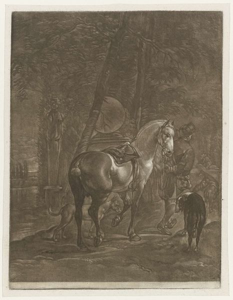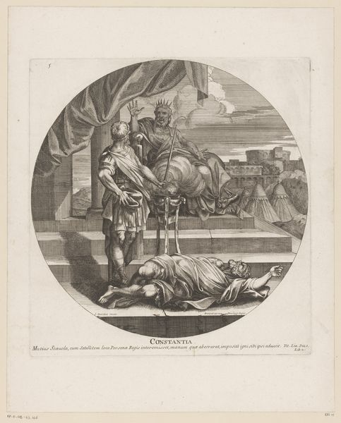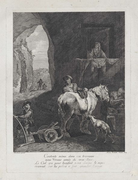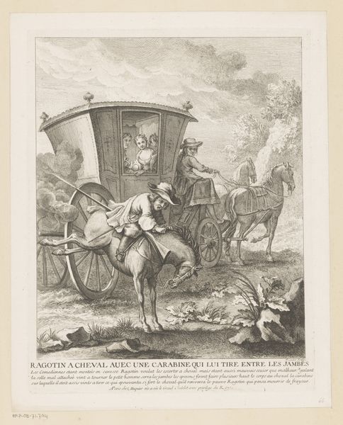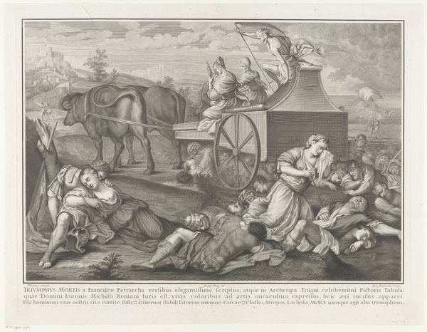 Curator: Up next, we have "Grootmoedigheid," or "Magnanimity," an engraving, created sometime between 1663 and 1738, attributed to Jacques-Antoine Friquet de Vauroze. It depicts a triumphant figure in a chariot. Editor: Immediately I feel a sort of… energetic reverence. It’s powerful but constrained within that diamond shape. What jumps out is the sheer exertion—the people struggling, the horse straining, that feels incredibly palpable. Curator: That diamond framing is interesting, isn't it? It really boxes in the scene, and perhaps speaks to the controlled nature of Baroque allegory. There's so much contained energy—a fascinating contrast! Note how even within that limited space, the artist is invoking themes of grandeur. Editor: Exactly! And what a strange mix of messages… We're supposed to admire this “Magnanimity” being displayed but look at the physical toll – even brutal - it extracts from these supporting figures and the animal. Curator: Right, the triumph celebrated comes with a cost, vividly rendered in their straining bodies. I wonder if viewers then would’ve seen this sacrifice differently – an expected part of the victor's honor, maybe? The symbolic gesture, so integral to triumphal entries through gates of power and civic stages of power, could well make that price palatable. Editor: Yes, fascinating! I see it now—not so much a glorification, perhaps, as an exploration of that cost, revealed to the informed reader, willing to linger and look closely at these details. A Baroque meditation on power. Curator: It invites one to look beyond the apparent prestige and question what feeds that display of… generosity or greatness. To ponder that perhaps the price of honor always entails sacrifices by others, be they literal, physical sacrifices, or just some subtler emotional kind of cost. Editor: Very astute. This reminds me again that even the most powerful imagery contains questions far beyond immediate glorifications of state and power. There's a very contemporary sentiment embedded in what we might otherwise casually accept as just historical décor. Curator: I concur entirely: and it keeps on challenging me.