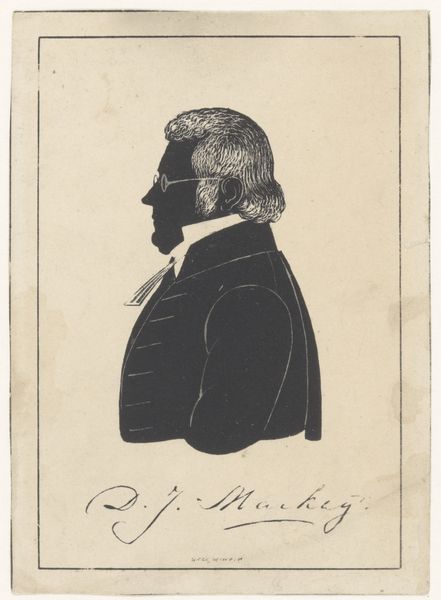 Editor: Here we have Pieter Barbiers' "Silhouette Portrait of Daniël Johannes Mackay," made sometime between 1809 and 1848. It's a simple ink drawing, but there's something striking about the clean lines of the silhouette. What strikes you about this piece? Curator: For me, the interest lies in the material process itself. A silhouette is, by definition, a process of reduction, boiling down identity to an outline. It speaks volumes about the materials available and the economic circumstances that might lead someone to choose such a method of portraiture. Editor: So you see it as a kind of resourceful or economic choice of the artist? Curator: Precisely. Ink was more accessible than painting, and the skill to create a likeness resided not just in artistic training, but in the precision of hand and eye, almost a craft. We should also consider the social implications; portraits democratized through less expensive mediums meant a wider circle of society could participate in image-making and memorialization. How do you view the impact of the production technique here? Editor: I hadn’t really thought about it that way. It's fascinating how a choice of medium can reshape access and perception, from something like painting to something almost like stenciling. Curator: Exactly! It makes one question what’s valued—the skill of the hand or the availability of the product to the masses? It collapses high art ideals of individual genius and skill. What do you make of the implications about who gets represented and remembered through artistic creation? Editor: I guess that makes me rethink silhouettes and their role, how the material informs not just the appearance, but the entire social story around it. It’s definitely much more than just a picture. Curator: Indeed, looking through a materialist lens brings new dimensions to understanding and valuing the work, placing the focus back on the labour of creating art, and not solely on aesthetics or status.
