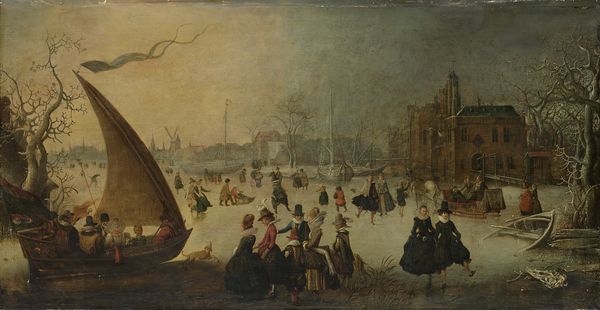 Curator: Hendrick Avercamp's "Winter Landscape with Skaters," dating back to 1630, offers a fascinating glimpse into the social life of the Dutch Golden Age. Editor: Wow, it's like stepping into a Bruegel painting that got a serious case of the blues! All those figures on the ice… it makes me feel both cold and strangely festive. Curator: Indeed! Avercamp specialized in these lively winter scenes, and it’s interesting to consider them as documents of everyday life and leisure across different social classes. We see the wealthy distinguished by their refined attire alongside peasants and working-class citizens all enjoying the frozen waterways. Editor: The level of detail is astounding. I keep finding these tiny human moments. A couple of skaters holding hands, kids tripping, a dog just trying to not eat ice. It's really humorous and sad at the same time; you know? Life's absurd theater just happening on a giant frozen stage. Curator: That “absurd theater” also raises critical questions about climate and its impact on social life in the 17th century. It’s not just a picturesque scene. The freezing of the waterways dramatically changed how society interacted. This temporary unity and accessibility also disrupted established hierarchies, where traditionally waterways functioned as dividing and segregating urban environments. Editor: I love that idea. It makes the painting subversive. All those individuals sharing this strange, icy plane and perhaps temporarily released of society's expectations or prejudices. It makes me feel as though paintings don't always reflect life but that sometimes they really hold the mirror up to nature in order to tell another side to it. Curator: Absolutely. Furthermore, these paintings helped create a sense of national identity during a time of significant political and economic change. By capturing the specific details of Dutch towns and landscapes, artists like Avercamp contributed to the construction of Dutch cultural identity. Editor: Thinking about the bigger historical context and knowing how many people probably slipped on the ice or just desperately wanted a cup of hot chocolate, is an endearing thought. I’m really glad for these works because sometimes a memory about collective suffering and fun helps. Curator: Absolutely, looking closely into "Winter Landscape" reminds us of the intertwined threads of social connection, climate's transformative effects, and the emergence of national identity in the Dutch Golden Age. Editor: I will keep that in mind while desperately wishing that somebody brought me some of that hot chocolate!