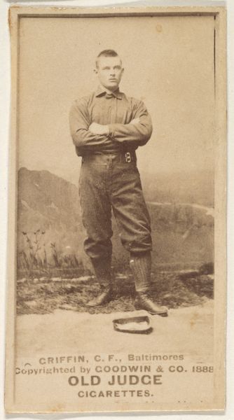 This small photographic print, produced by Goodwin & Company around 1888, presents Farrell, a 2nd baseman for the Baltimore Orioles. He stands with his hands on his hips, a gesture that speaks of confidence and self-assuredness. This pose, with hands assertively placed on the waist, echoes through centuries, appearing in classical sculptures of triumphant athletes and Renaissance portraits of powerful rulers. The gesture signifies control, dominance, and a readiness to act, reflecting a deep-seated human desire for agency and recognition. Think of the ancient Greek statues, their athletes embodying physical perfection and competitive spirit. The shift from god-like and aristocratic figures to a baseball player is significant. Here, the motif descends into the everyday. Yet, the pose retains its primal power, engaging us with a deep-seated sense of admiration for strength and skill. We see reflected in Farrell not just an athlete, but an icon of human potential, perpetually reborn in our collective consciousness.