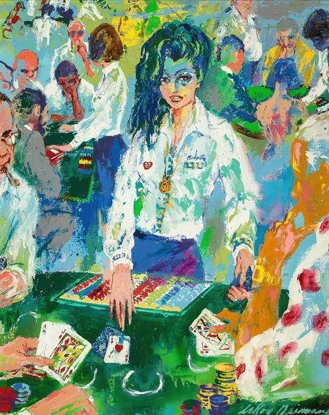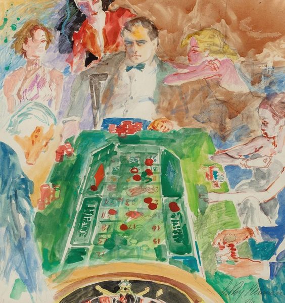 LeRoy Neiman's painting captures the electric atmosphere surrounding a roulette table. The spinning wheel, the colorful chips, and the expectant faces are all symbols of chance and fortune, echoing ancient rituals where fate was determined by casting lots or reading omens. The roulette wheel itself is a modern descendant of the Wheel of Fortune, a motif found as early as antiquity. In medieval art, the Wheel symbolized life's capricious nature, with figures rising and falling along its circumference. Here, the wheel's circular motion evokes this same sense of destiny, reminding us that fortunes can turn in an instant. The anticipation and anxiety inherent in gambling speak to a primal human fascination with risk and reward. The act of placing a bet, of surrendering control to chance, stirs deep-seated emotions. It's a ritual that engages us on a visceral level, tapping into our collective memory of games of chance and the unpredictable nature of life itself. The wheel turns, history repeats, and the human drama unfolds.