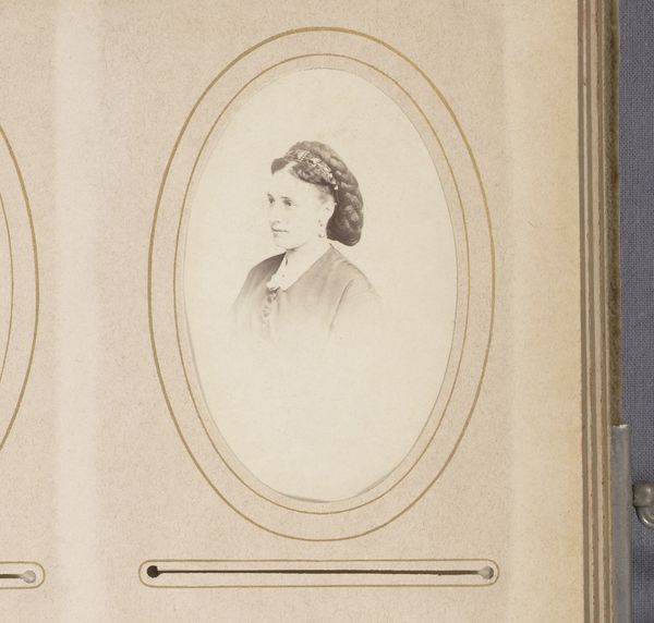 This is a portrait of a woman with earrings and braided hair by Jacobus van Gorkom Jr. The photograph, small in scale, presents a profile view encased within an oval frame. The limited tonal range emphasizes form over color, directing our attention to the composition's structure. The framing draws attention to the interplay between containment and exposure, questioning how identity is both revealed and constructed within social conventions. The woman’s braided hair, elaborately styled, contrasts with the simplicity of her pose. It suggests a deliberate manipulation of natural elements to meet cultural standards of beauty. The minimal background and tight crop remove the sitter from any specific context, turning her into a study of form and texture. This invites viewers to consider the semiotics of portraiture and the cultural codes embedded in representations of femininity. The very act of framing and displaying the portrait underscores how images mediate our understanding of self and others.
