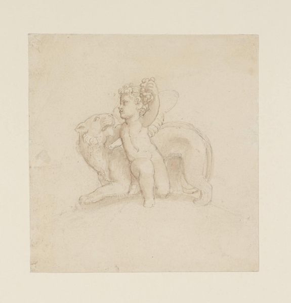 Editor: This is Gerhard Ludvig Lahde’s “Tavle med tre amoriner og derunder amor på en løve,” a drawing and engraving from between 1765 and 1833. It feels almost like a study, a preliminary sketch perhaps. The lines are so delicate. What do you see in this piece? Curator: Immediately, I’m struck by the juxtaposition of tenderness and domination. Three cherubs embrace at the top, a cluster of innocence and affection. Below, a single winged Cupid dominates a lion, spear raised. Lahde evokes a familiar visual language of power through allegory. Editor: Power? It seems so… gentle. Curator: Consider the lion – traditionally a symbol of strength, courage, royalty. Here, it’s been tamed, a foundation for Cupid’s perceived dominance. Think about the emotional resonance embedded in the symbolism of these images. Cupid isn’t just riding the lion, he’s subduing raw power, almost neutralizing the threat. Doesn’t that impact your impression? Editor: Yes, I see what you mean. It's not just cherubs and lions, but ideas of control and maybe even vulnerability, depending on how you interpret it. Curator: Precisely! The image explores these opposing forces— tenderness and the subjugation of power. Lahde taps into something very primal, linking love and control, innocence and power. What do you take away from how the images converse across time? Editor: It’s interesting how a simple sketch can hold so many layers of meaning once you start unpacking the symbols. I definitely look at it differently now. Curator: Visual symbols form our language of cultural memory; deciphering them lets us find resonance within the history of human experiences.