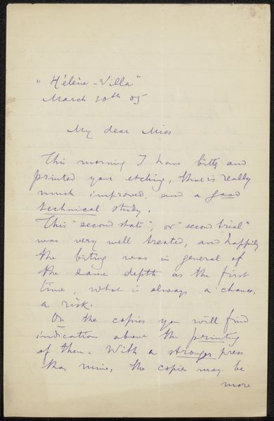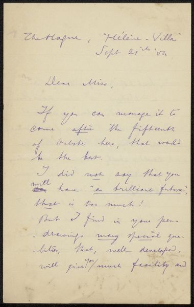 This is Philip Zilcken’s ‘Brief aan Elsie Maud Cownie’. The letter presents us with a pale ground covered in a web of cursive script. The dark blue ink of the writing creates a striking contrast against the paper, emphasizing the flow and rhythm of the handwritten words. Zilcken uses line and form here to create a personal connection, beyond its literary meaning. The handwriting itself becomes a medium, where each stroke and flourish adds texture and depth to the composition. The structured layout of the text, broken into neat lines and paragraphs, provides a sense of order, yet the fluid, almost uncontrolled nature of handwriting adds an element of spontaneity. In this interplay between structure and expression, Zilcken blurs the line between personal communication and artistic expression, inviting us to consider the letter not just as a message, but as a visual artifact.
