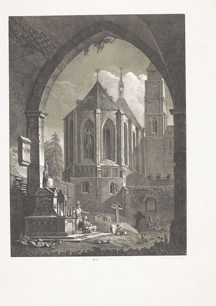 Editor: So, this is Samuel Prout's "Crypt of a Church." It has this really somber feeling, almost like a stage for something dramatic. What's your take? Curator: I see a critique of power embedded within the stones. Consider the church, historically a site of immense control. Prout renders it almost derelict, occupied by a lone figure, seemingly displaced. Who is afforded access to sacred spaces, and on what terms? Editor: That's a powerful reading. I was just thinking about the light. Curator: Yes, consider the play of light and shadow. It emphasizes the cavernous space, perhaps highlighting the church's historical role in creating social divisions and hierarchies. What do you make of the architectural details? Editor: It makes me think more about who gets to take up space and who doesn't. Curator: Exactly. Prout's art becomes a lens through which to examine these power structures.