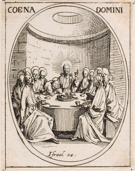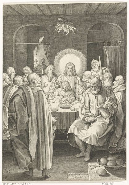 Editor: This engraving is entitled "Last Supper," made between 1590 and 1632 by Pieter de Jode I, and housed at the Rijksmuseum. The monochromatic composition really emphasizes the somber, weighty feel of the moment depicted, what do you see in this piece? Curator: Precisely, let's observe the formal elements. Notice the artist's use of line, which is both descriptive and expressive. The lines define form but also create texture and depth, contributing to the work’s overall structure. The vanishing point in the architecture directs the eye towards the figure of Christ. Is this an effective technique, in your view? Editor: I agree, the single-point perspective does bring focus to the figure. Does the baroque style further intensify the moment, contributing to its visual richness and drama? Curator: Consider how the play of light and shadow, although subtle in this engraving, emphasizes the central figures and the event's gravity. The material quality of the print itself, the texture of the paper and the incised lines, invite a tactile, sensory engagement with the artwork, do you find that materiality adds value? Editor: I see what you mean, it’s a reminder of the artist's hand and process. It makes you think about each stage. I now understand the value in examining these individual components. Curator: Precisely, understanding these can transform our understanding of it. The beauty often resides within these details. Editor: Thanks, it definitely brings a new level of appreciation to viewing engravings. Curator: It does for me, too.