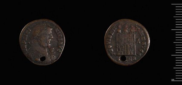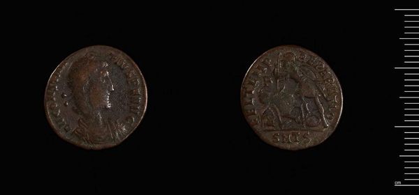 Curator: Here we have a small coin, an AE3/4 of Constantius II, minted in Siscia. Editor: Immediately, I'm struck by its worn condition, like a tiny, battered time capsule. What secrets has this little metal disc witnessed? Curator: Well, the image of the emperor on one side embodies power, while the other side displays symbolic imagery, perhaps alluding to military or imperial themes. Editor: It's almost comical, this miniature monument to imperial ego, surviving centuries of human folly. Curator: Coins like this were potent symbols, circulating not just currency but also ideology, subtly influencing the collective psyche of the Roman world. Editor: I suppose even in its weathered state, it still echoes with the hubris of emperors long gone. Curator: Precisely, which reminds us how symbols persist and shape our understanding of history. Editor: A humbling thought, isn't it? That even the smallest object can carry so much weight.