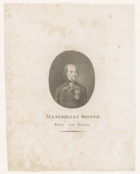 Editor: So, this is a print of a portrait of Maximilian I Jozef, King of Bavaria, made between 1806 and 1843 by Johann Carl Bock. The printmaking technique gives it a very formal, almost austere feel. What stands out to you most about this portrait? Curator: The symbolic weight, definitely. The oval frame immediately recalls classical cameos, associating Maximilian with the gravitas of Roman emperors. And the light! Notice how it illuminates the King's face, directing the eye towards his expression—one carefully composed to convey authority, yes, but also perhaps a hint of benevolence? The medals and adornments aren't just decoration; they're carefully chosen symbols meant to communicate power, legitimacy, and connection to Bavaria’s history. What do *you* read in those symbols? Editor: I see status and wealth. But, do you think audiences at the time understood those symbols more deeply? Or are we overanalyzing? Curator: Oh, without question. These symbols acted as a form of visual shorthand, instantly communicating to the viewer concepts of power, lineage, and even divine right. They served as a critical means of reinforcing cultural memory, connecting the ruler to a broader narrative. Do you see how the relatively muted colors direct our gaze right back to his face, that controlled and dignified expression? Even the style, the Neoclassicism, speaks of reason, order, and a return to perceived golden ages. Editor: That's fascinating! I had just considered it a very typical portrait. Curator: Consider it a carefully constructed narrative in ink. Bock uses an established visual vocabulary to create a very specific message about Maximilian and his reign, preserving this narrative in cultural memory. Editor: It makes me see portraiture in a completely new way. Thank you!