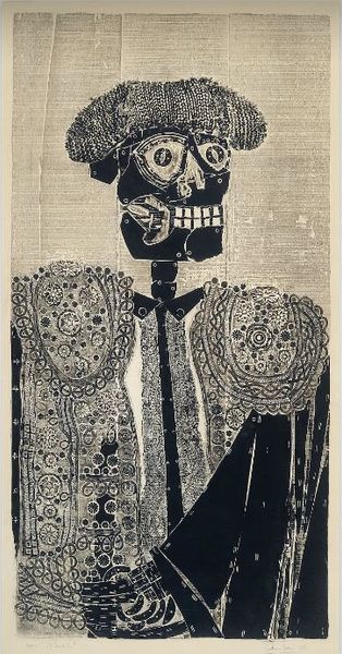 Curator: Here we have José Guadalupe Posada's "Calavera Madero", currently held at the Harvard Art Museums. It measures about 35 by 19 centimeters. Editor: What a striking figure! The cross-hatching creates such a tangible texture—the straw hat looks almost prickly. Curator: Posada was a master printmaker, and this piece, like many of his calaveras, likely started as a zinc etching. These were printed on broadsides and were aimed at a wide audience. Editor: The bottle and sarape draped over the skeletal figure—these are potent symbols of Mexican identity. It suggests a playful yet critical commentary on culture and class. Curator: Precisely! And consider how the printing process allowed for mass distribution, making social satire accessible to the working class. Editor: There's a dark humor here, a memento mori that's also festive. The symbols invite us to contemplate the human story. Curator: Indeed, it makes you consider the labor involved in producing and disseminating these images. Editor: It is a remarkable piece, and the symbols remain quite powerful.