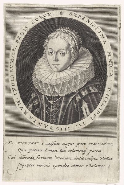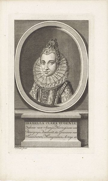 Editor: So, this engraving is a portrait of Isabella Clara Eugenia, Infanta of Spain, made by Jacob Houbraken, sometime between 1749 and 1796. It has an austere feeling, partially due to the medium. What aspects of production and making of art stand out to you in this portrait? Curator: The most compelling aspect is the engraving process itself. Think of the labor involved in creating this image. Each line, each dot, carefully etched into a metal plate. It’s not just a portrait; it’s a testament to skilled craftsmanship. What can this painstaking method of reproduction tell us about how art was consumed in the period? Editor: I hadn't thought about that! So, was it meant for mass consumption, given the ability to make copies? Curator: Precisely. Engravings democratized images, bringing portraits of the elite to a wider audience. However, that audience may not have fully enjoyed the final result of the artmaking if they were of the peasant class. How might social class dictate the consumption of a luxury portrait? Editor: It's like it both includes them but excludes them, as only certain consumers could obtain the engravings, but they get to enjoy them all the same, for far cheaper. I see the complexity now. What are the historical roots that can be pulled here, perhaps in comparison to our new technologies of art reproduction? Curator: Consider the contrast between this handcrafted method and today's digital prints. The difference is clear: the material relationship between artist, tool, and image has drastically shifted. The engraving process inherently imbues the artwork with the labor and skill of the artist in a way that digital reproduction often obscures. Is there anything unique you feel as an artist in viewing this work? Editor: This makes me appreciate the tactile quality of traditional art forms. Thanks, I will look at art through a materialist lens from now on. Curator: Fantastic. I’ve found this discussion equally thought-provoking!