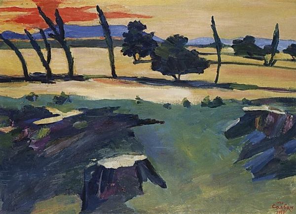 Istvan Ilosvai Varga made this oil painting, Nagybánya, which depicts a rural scene, possibly in Hungary or a surrounding region. The vivid colors and abstracted forms suggest a connection to early 20th-century Expressionism, a style that often conveyed emotional intensity and a subjective interpretation of reality. The title refers to a town known for its artist colony, which played a vital role in the development of Hungarian art. It became a space where artists explored new styles and approaches outside the rigid academic structures of the time. The avant-garde were taking hold and this painting could be read as a comment on the move away from traditional representations. To truly understand this work, we must look at the historical context of the Nagybánya colony and the socio-political forces that shaped the artistic landscape of Hungary in the early 20th century. Investigating archival documents and critical reviews from that time can help reveal the complex interplay between art, society, and the institutions that supported or challenged it.