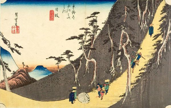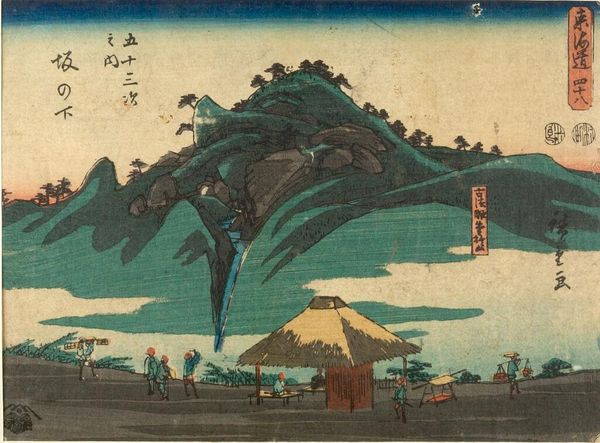 Editor: This print, "Sakanoshita: Fudesute Mountain" by Utagawa Hiroshige, part of the "Fifty-three Stations of the Tōkaidō Road" series, feels so meticulously balanced. There's a real contrast between the dramatic mountain and the calm figures at the resting place. What do you see in this piece? Curator: The mountain, Fudesute, means 'discarded brush.' It resonates with a cultural memory of artistic frustration and renewal. Note how the stark lines contrast with the softer, more communal scene at the rest stop. Editor: So the discarded brush symbolizes a creative block? Curator: Perhaps. Or the courage to abandon one's work and start anew, finding inspiration in the everyday. The image becomes a meditation on the journey, both literal and artistic. Editor: That's fascinating. I never considered the title's symbolic weight within the larger narrative of the Tōkaidō journey. Curator: Exactly. Hiroshige weaves a complex tapestry of lived experience and cultural metaphor.