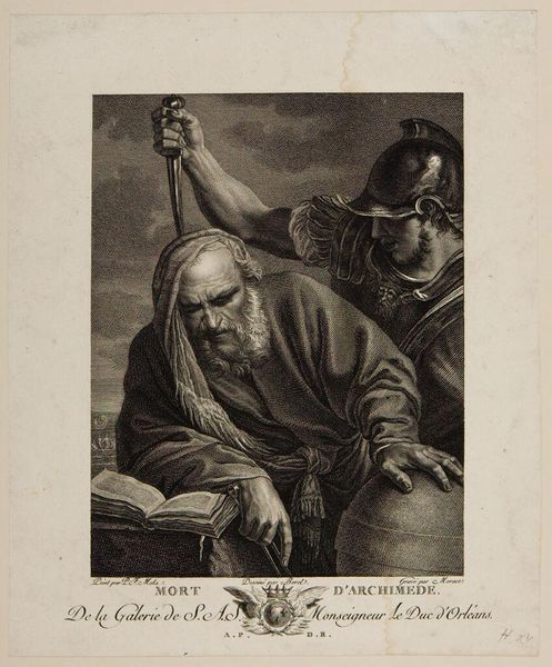 Editor: This is "Moord op Archimedes," or "The Murder of Archimedes," a print made sometime between 1776 and 1820 by Ernst Morace. The crispness of the engraving is striking. I'm really drawn to how Morace captures the texture of the fabrics and the smoothness of the globe. What aspects stand out to you? Curator: I see a clear emphasis on production. The engraving itself is a testament to the skilled labor involved in reproducing images, making historical narratives accessible to a wider audience through print culture. The stark contrast highlights the brutal materiality of the soldier’s weapon against Archimedes' vulnerable flesh. The book and the globe, crafted objects themselves, speak to human knowledge and its precariousness. Editor: So, you're focusing on the physical elements as a way to understand the meaning? Curator: Precisely. Consider the context: this work emerged during a period of revolution and upheaval. The neoclassical style, with its emphasis on line and form, references classical ideals. However, the medium of print democratizes this style and carries within it an element of reproducibility and mass consumption of such aesthetics. Do you see the contrast between the violence of the subject and the refined style in which it's made? Editor: Yes, definitely. There’s almost a tension between the clean lines and the violent act. It's like the tools of knowledge and reason—the book, the globe—are being directly confronted by brute force, made possible by the very real labor that produced that sword. Curator: And, how might the relatively cheap and accessible medium of print, compared to, say, oil painting, affect the interpretation of this historical event? How does its accessibility speak to revolutionary ideals, or even comment upon their failures? Editor: I hadn't thought about it that way. I guess that by making it a print, it is, in a sense, industrializing and commodifying this dramatic event, but also making a powerful statement about the fragility of intellect when faced with physical power. Thanks, I’m definitely seeing this print in a new light.