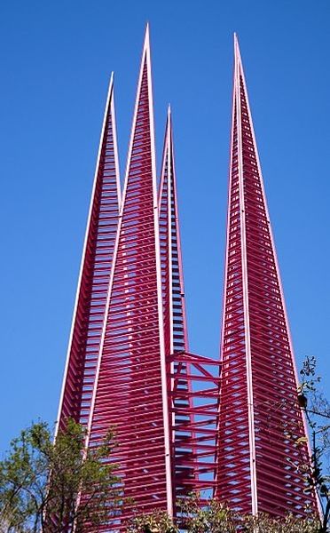 Editor: This imposing sculpture is “Three Discs (The Man)” by Alexander Calder, created in 1967. Made of metal, its abstract, geometric form really strikes me. It feels both futuristic and, somehow, ancient. What do you see in this piece? Curator: You know, sometimes I think Calder was channeling some ancient titan when he created this. Or perhaps a friendly giant. I'm struck by its joyful, almost whimsical character. These forms—the discs, the sweeping curves—they remind me of a child's drawing, but rendered in this monumental, industrial scale. Look at the relationship between the sharp angles and smooth curves! They clash, they play off each other. Do you get a sense of implied movement here? Editor: Yes, definitely. The way those curved shapes lean... it's like the whole thing is about to take off! But I’m also getting a kind of human figure reading the tag, even though it's abstract. I can almost see arms raised, you know? Curator: That’s the brilliance, isn’t it? This isn't just some cold geometric exercise. It evokes something deeply human – maybe aspiration, or reaching for something beyond ourselves. You mentioned futuristic and ancient – that friction resonates! The use of metal provides the structure and strength and emphasizes permanence. Editor: It really is interesting how those geometric shapes feel so expressive, you know? And seeing it outside, with the city in the background adds another dimension. Curator: Exactly! Its beauty interacts with the surroundings – as though nature herself is engaging with it in a slow-motion dance. Soaring ambition mixed with raw strength; what is more essentially *human* than that? It gives you the urge to touch it, doesn’t it? Feel the rivets... trace the forms... become one with “The Man” Editor: It really does. This makes me consider abstract art so much differently; It definitely isn't all lifeless angles and cold geometry, but an embodiment of soul! Curator: It sings of freedom and possibility, of grand dreams built on solid ground. The feeling lingers.