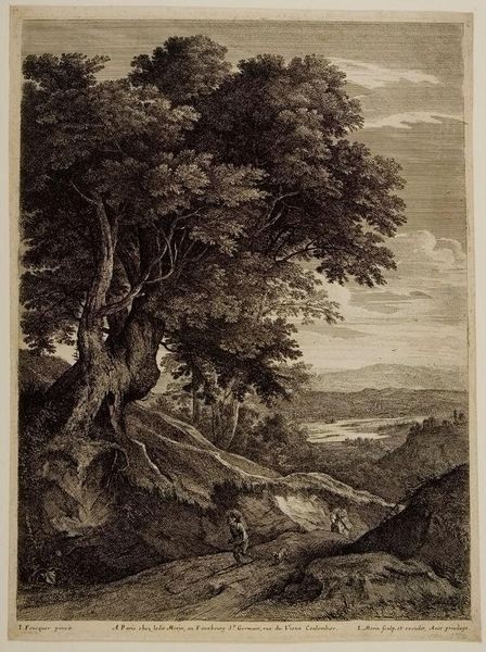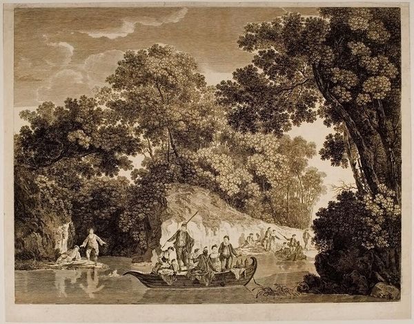 Editor: This is James Mason’s “Rest of the Travellers." It's a detailed scene, seemingly depicting people from different social standings resting by a river. What can you tell me about its social context? Curator: Notice how the figures arrange themselves within the landscape, mirroring hierarchical structures of the time. The armed guard stands above, surveying the resting travelers. Consider the power dynamics inherent in leisure itself. Who has the privilege to rest, and under whose protection? Editor: That's fascinating. So the idyllic scene is also a commentary on social power? Curator: Precisely. The seemingly peaceful rest is contingent upon existing inequalities and social contracts. Examining art like this allows us to question the narratives of privilege and access. Editor: I never considered leisure in that way before. Thanks for offering a fresh perspective. Curator: It’s crucial to analyze how art both reflects and shapes our understanding of historical power structures.