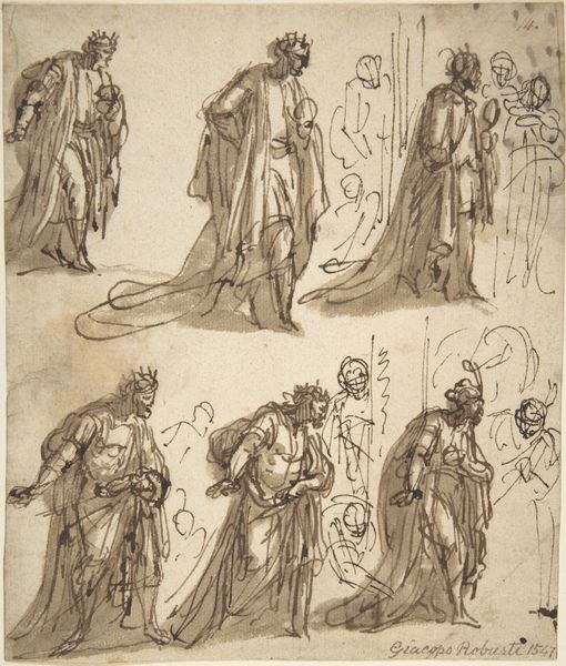 Francesco Vanni created "Figure Studies: Standing and Kneeling Clerics and Religious, Adam and Eve, and a Reclining Skeleton" with pen and brown ink in the late 16th to early 17th century. During the late Renaissance and the Counter-Reformation, religious imagery was central to cultural and political life. Vanni, deeply entrenched in this environment, explores themes of faith, morality, and human existence through his sketches. We see the clerical figures embodying the era's complex relationship between spiritual authority and human fallibility. Adam and Eve represent humanity's original sin and subsequent struggle for redemption. This reflects the period's concerns about morality, sin, and salvation. Notice how Vanni places a reclining skeleton amidst these religious figures, a stark reminder of mortality. These sketches offer us an intimate glimpse into Vanni's artistic process. Consider how these studies not only reflect the prevailing religious sentiments of the time but also Vanni's personal exploration of faith, doubt, and the human condition.
