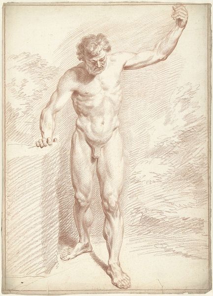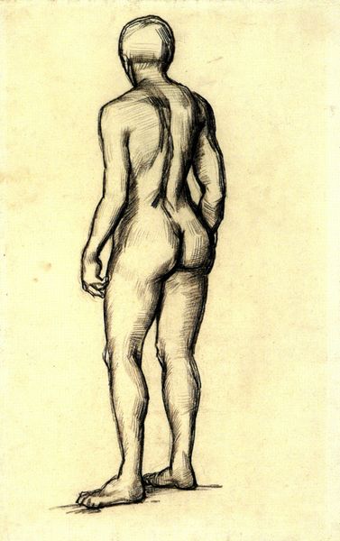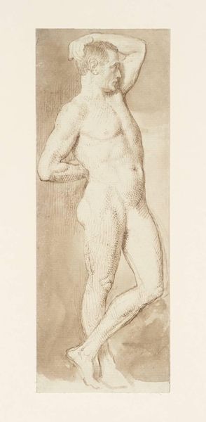Curator: Here we have Hendrik de Flines's "Standing Male Nude, Seen from the Back, Leaning on the Right Knee," dating from around 1784 to 1798. The medium appears to be primarily charcoal and pencil. Editor: Wow. The first thing that strikes me is this incredible vulnerability. He's literally exposed, yes, but it's the slumped posture and averted gaze. He looks burdened. Curator: Precisely. The artist masterfully uses line and shadow to emphasize the musculature of the back, creating a dynamic interplay of light and form. Consider, for example, the tension in the trapezius muscles and how they resolve into the deltoids. Editor: It’s almost melancholic. The academic precision gives way to… what? A whisper of Romanticism? That red chalk… it looks like he's blushing with shame or exhaustion. Like some god who has fallen to earth. Curator: The red chalk indeed contributes significantly. The restrained palette allows for an emphasis on tonal variation, crucial for delineating depth and volume. We see how de Flines employed hatching and cross-hatching to sculpt the figure. Editor: Right! Look at the density around the spine versus the subtle feathering near the buttocks—that textural difference really animates the figure. What do you make of the almost complete lack of context? It really puts him in his own psychological space. Curator: An excellent observation. The neutral background serves to isolate the figure, emphasizing its formal qualities. This work prioritizes the idealized male form in line with the classical aesthetic of the time. A clear study in form. Editor: Yes, but... There is also the undeniable sense of intimacy the artist evokes. The man becomes, momentarily, our own intimate and flawed reflection, regardless of any academic tradition. It is his back we see; yet, somehow, it mirrors our feelings of vulnerability. Curator: A perspective well considered. De Flines's technique is remarkable and worth studying, undoubtedly. Editor: Ultimately, the artist succeeds in conveying a human fragility that remains touching and powerful to this day. Thank you for pointing me towards a new angle on looking at old masters!