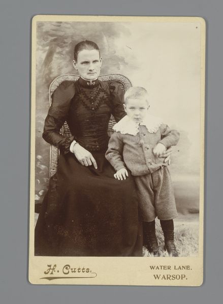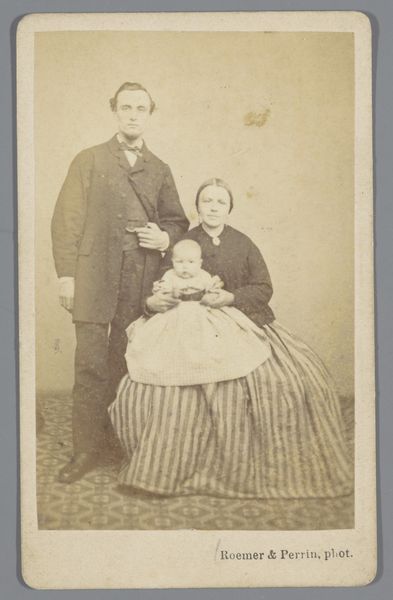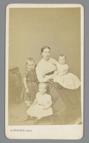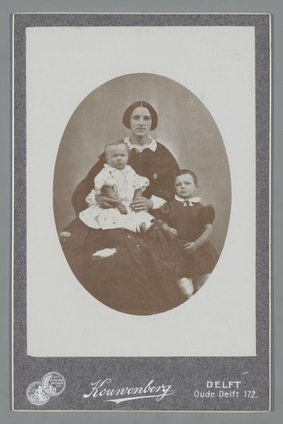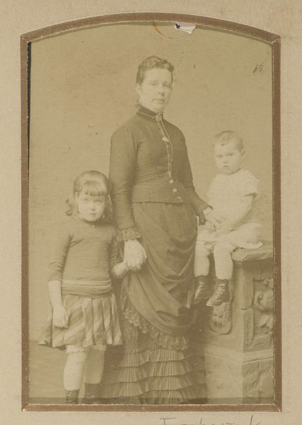 Curator: Here we have a photograph titled "Portret van Truus van Leeuwen met haar kinderen Dirk en Teun," placing Truus at the center with her children. It’s thought to have been taken between 1867 and 1870, created as a gelatin silver print. Editor: There’s a kind of melancholy in this portrait, don't you think? The lighting, the expressions… it speaks of a particular moment frozen in time, weighted down a bit by formality, yet tender with the mother and her children. Curator: The choice of the gelatin silver process is key. By that era, it was allowing for greater detail and reproducibility compared to earlier photographic methods like daguerreotypes or albumen prints, making portraits like these more accessible to a rising middle class. Think about the labor involved—preparing the plates, developing the print—it all contributed to the final object's perceived value. Editor: Absolutely. And there's the backdrop. That textured ground doesn’t distract much from her face and from how that little child’s shoes look huge on her tiny feet. She probably grew into them very fast! It is so nice they get recorded like this! It triggers that cozy feeling one gets on vintage photo hunts at thrift stores. It is also hard to avoid noticing this little boy and his cute walking stick. He looks so dapper! Curator: We also see the performance of motherhood here, how the expectations of gender roles get represented. The voluminous dress she wears signifies prosperity, stability. Her pose also: seated and embracing the child shows the period's values, like her dedication to children and a bourgeois life. Editor: Well put! She doesn’t look especially thrilled about having her picture taken. More like resigned? But in a graceful way? There’s an underlying strength. What materials could tell, if only they spoke more about how it felt like to sit so rigidly with restless children. Curator: These photographs served as important markers of identity and social standing. Owning one's likeness signaled belonging. The silver gelatin prints are inherently reproducible and less precious than a unique print from older days of photography. They capture ordinary lives and social mobility, revealing their consumer value, and turning art into an industrialized creation of sorts. Editor: It’s true. So much about the period and its values, revealed simply by observing this maternal bond that feels still recognizable, almost familiar after so many years! Curator: Indeed, seeing her as more than simply a “mother”, and recognizing her societal role as an important piece of history itself brings a great sense of value for understanding society.