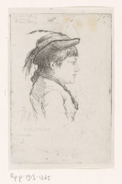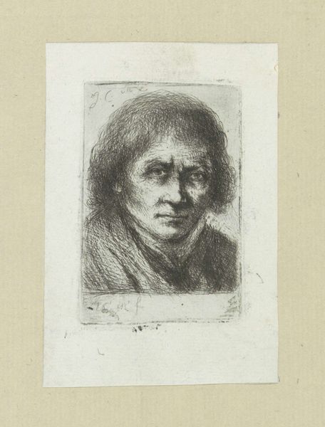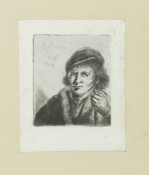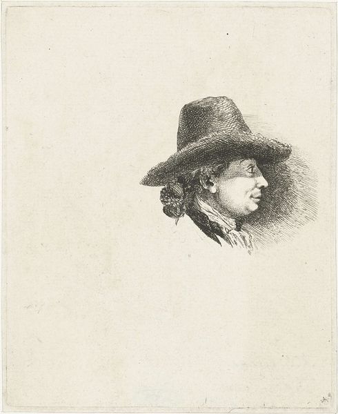 This etching, 'Man met hoge hoed' by Jan Chalon, captures a figure with a tall hat through delicate lines and a monochromatic palette. The figure emerges from a network of fine strokes, creating a sense of depth and texture within the small dimensions of the print. Chalon masterfully uses line to delineate form and suggest light, achieving a remarkable sense of detail. The composition centers on the contrast between the densely worked areas—defining the hat and clothing—and the relatively bare areas of the face, drawing attention to the figure's gaze. This interplay not only showcases Chalon’s technical skill but also invites consideration of the sitter's presence. The use of hatching and cross-hatching adds a semiotic layer, where darker areas convey not only shadow but also the weight and material of the clothing. The etching medium itself enhances the artwork's intimate scale, encouraging close examination and reflection on the subtle nuances of character. This piece functions aesthetically and as a study in representation and social identity during Chalon's time.