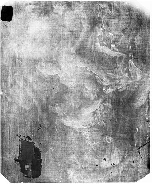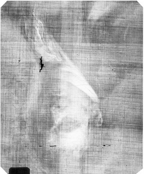 Curator: This is an X-radiograph of John Singleton Copley's "Mrs. Joseph Mann", residing here at the Harvard Art Museums. It’s like peering beneath the surface of time itself! Editor: My first impression is a ghost in linen. A spectral presence barely clinging to the woven grid of the canvas. Curator: It reveals underpainting, the artist's process, revisions invisible to the naked eye. You can see how Copley built up layers, altering the composition. Editor: The darkness pooling at the base, perhaps where the sitter’s dress rested, creates a somber, almost unsettling foundation. What secrets does this reveal about Copley's technique? Curator: It humanizes the process. Painting wasn't this immaculate, pre-ordained act. It was messy, intuitive, and evolving. Editor: Indeed. The stark contrast forces us to confront not just the image, but the making of the image. It invites a re-evaluation of artistic intention. Curator: Seeing art this way transforms our understanding—it’s like witnessing a painter’s private conversation with the canvas. Editor: I’ll never look at a portrait quite the same way again. It encourages us to consider the unseen labor that shapes our perceptions.