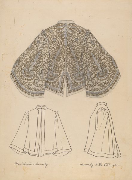 Editor: So, this is "Basque" by Florence Earl, from around 1938. It's a drawing, pencil and charcoal on paper, of a very elaborate jacket. I'm struck by how decorative it is. What stands out to you? Curator: The intricate detail certainly draws the eye. But beyond the visual appeal, consider the labor involved in creating not only the garment itself but also this incredibly meticulous drawing. Who would have worn such an article of clothing and under what circumstances? Who produced the original jacket? And how does Earl’s rendering elevate or perhaps commodify this act of production? Editor: That's a really interesting point – thinking about the labor and class implications. I hadn't considered that. So it's not just about the aesthetic qualities of the drawing. Curator: Exactly! Earl, like many artists of the time, grappled with shifting boundaries between “high” art and craft. Look at the material reality of the paper, the charcoal – common materials used to depict a unique garment meant only for display in an elite context. The consumption and display of elaborate garments involved exploitative labor conditions to support wealthy consumer culture. Editor: Right, it is using accessible material to create a likeness of an object born from industry, which suggests something of a commentary by the artist. So, by depicting it in this way, she is maybe calling our attention to those inequalities and processes. Curator: Precisely. Do you think the "decorative art" styling is in conflict with the artist’s possible critique? Editor: It is, or can be. This kind of perspective invites a very nuanced look into art making that I didn't have before. Thank you! Curator: Indeed, analyzing art through the lens of production reveals power dynamics and questions embedded in its creation and reception.