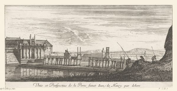 Editor: Here we have Israel Silvestre's "Gezicht op de poort van Sint Nicolaas in Nancy," made around 1650. It looks like an ink drawing, and what strikes me most is how the architecture of the gate contrasts with the open landscape. What do you see in this piece, particularly in the way it represents urban space? Curator: I see a deliberate act of documentation intertwined with an assertion of power. Consider the Baroque period's focus on grandeur and control. Cityscapes like this weren't merely records, they were carefully constructed representations meant to convey the strength and order of the ruling powers. The perspective, for instance, isn't just a technique, but a visual metaphor for control—a singular, dominant viewpoint. Editor: So, it’s less about accurately depicting Nancy, and more about portraying an idealized image of authority? Curator: Precisely! And consider the figures populating the landscape. They're dwarfed by the imposing gate, their presence almost an afterthought. What does this suggest about the individual's role in relation to the state at the time? How does this portrayal minimize marginalized people, specifically people of color, queer people, women, and others, from having ownership of urban spaces? Editor: That’s a great point. I was focused on the artistic elements, but thinking about who is centered and who is pushed to the margins, even in a city view, changes how I see it entirely. Curator: Exactly! By engaging art through such critical lenses, we reveal how seemingly benign depictions have the potential to be charged with the socio-political undercurrents of its time. Editor: This makes me realize that even landscape art can be read as a statement on power and social structures. Curator: And it’s our responsibility to analyze that. Every work carries such potential commentary. Editor: Thanks for that insight. I will definitely view landscapes and cityscapes through a different lens moving forward.