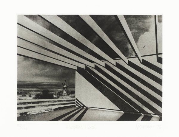 Lauretta Vinciarelli made "Long Horizon II" with watercolor and graphite on paper. The composition is dominated by strong architectural forms in earthy tones, sharply angled and reflected in a serene pool of water. These elements create a captivating interplay of light and shadow, where geometries evoke a sense of contemplative space. Vinciarelli, trained as an architect, uses perspective to blur the boundaries between interior and exterior, reality and reflection. This watercolour is not just a visual representation but a philosophical exploration. It challenges fixed notions of space, inviting viewers to question the nature of perception. The repeated geometric shapes and their mirrored images suggest a semiotic system where forms act as signs, pointing towards deeper meanings about structure and representation. Ultimately, this artwork destabilizes our understanding of space and perspective. It encourages us to see beyond the surface.