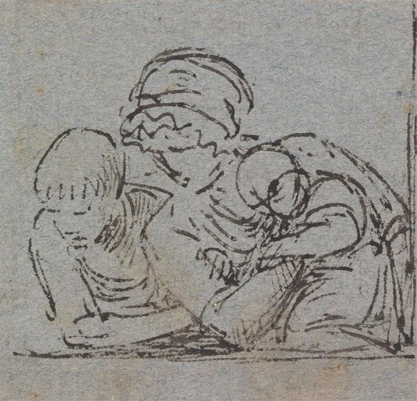 Curator: Ah, "The Two Madonnas," drawn around 1923 by Robert Austin. Look closely; you'll see it’s crafted with both pencil and pen, a delicate dance on toned paper. Editor: It's quiet, almost haunting. The way the light catches the figures makes them seem so weary, so earthbound, despite the title. It feels more like observation than reverence. Curator: That’s a sharp reading. Austin was deeply influenced by the Italian Renaissance, specifically masters like Mantegna and Piero della Francesca. He frequently used religious imagery but infused it with modern sentiment. The setting, a humble dwelling instead of a cathedral, emphasizes the everyday lives of the subjects. Editor: I love how the building, little more than a crude structure, forms a sort of halo. There's vulnerability in their slumped postures. The sketches around the core subject makes you feel like you're peering into a private, personal sketchbook entry rather than viewing something intended for public eyes. Curator: Absolutely. In this era, the traditional image of motherhood was often romanticized, but here, Austin presents it raw and unfiltered. The "madonnas" seem burdened, careworn—challenging viewers to reconsider the idealized version. It speaks volumes about societal expectations and the realities of the working class during that period. Editor: You know, it almost feels subversive. To present this intimate scene, these weary mothers, with a title invoking such strong religious overtones forces a re-evaluation. Were these sketches preparation for an image of Mary, reframed by social observations? I almost want to call them anti-Madonnas. Curator: Interesting! This work is a poignant reminder of art's capacity to both uphold and challenge convention. By rendering it with such unassuming methods, Austin has created space for quiet, individual experience. Editor: I like that perspective. Ultimately, "The Two Madonnas" is a sketch, yes, but also an invitation to look beyond iconography.