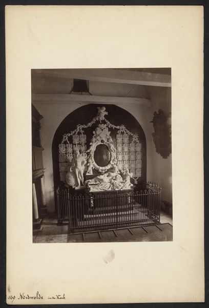 This photograph shows the Grafmonument van Cornelis de Witt in the Grote of Sint-Laurenskerk in Rotterdam, taken some time ago by an anonymous photographer from Monumentenzorg. The sepia tone gives a strange feel to the image; it’s like the shapes are emerging out of a fog, or out of history. The surface of the monument is fascinating, isn’t it? I can feel the way the sculptor has chipped and carved the stone. The figures, like those at the top with the trumpet, look a little rough, a little unrefined. I like that a lot. Look at the figure lying prone at the base of the monument, there's a real sense of depth, and a ton of detail - the fabric is really something! It makes me think of the work of Giovanni Lorenzo Bernini, an Italian sculptor known for his highly-detailed and dramatic sculptures. The material qualities, and the rawness of the medium really shape my experience of this artwork. Art's like a big conversation that never ends, right?